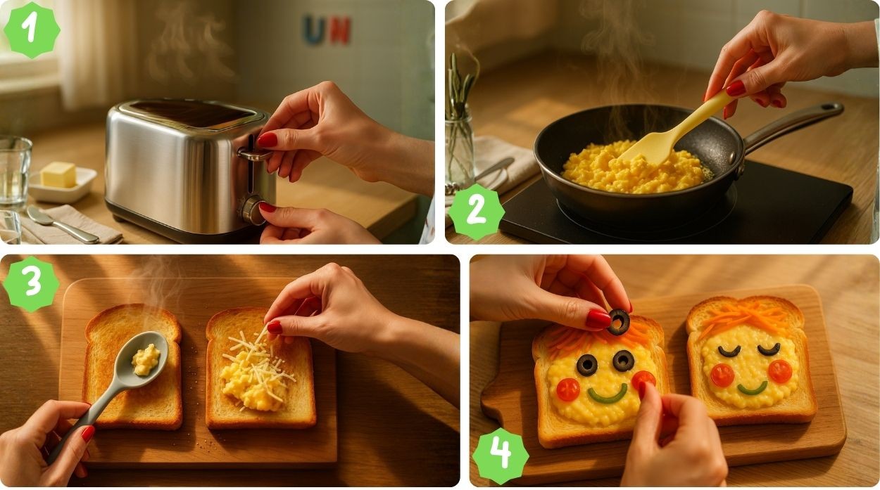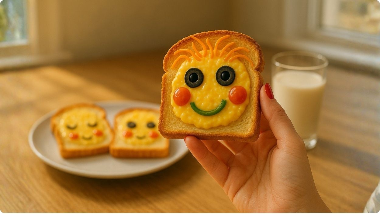 Made with golden toast, fluffy scrambled eggs, and colorful veggies — a joyful breakfast that lets kids eat their feelings with a smile.