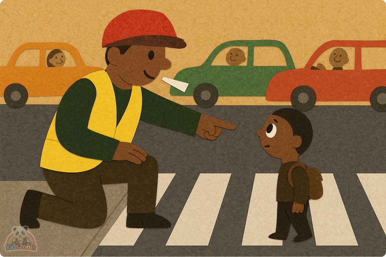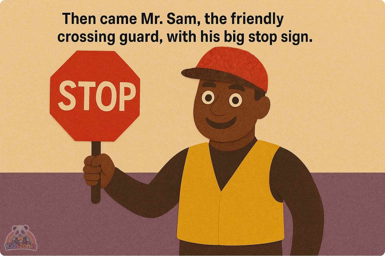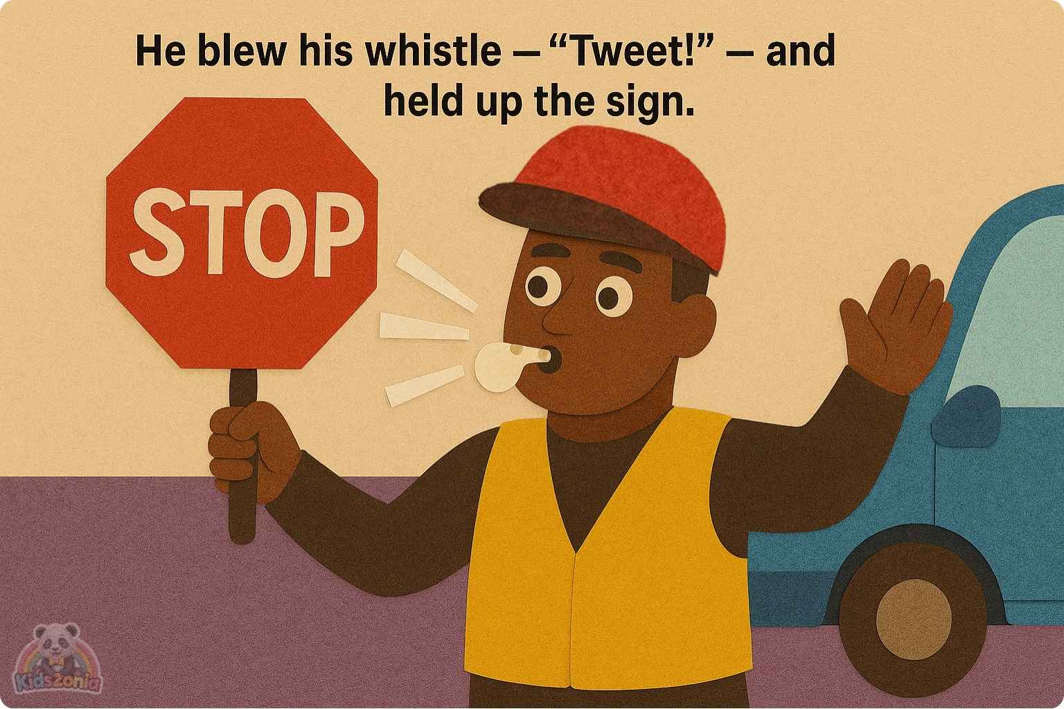 A caring crossing guard teaches everyone that safety, patience, and kindness go hand in hand!