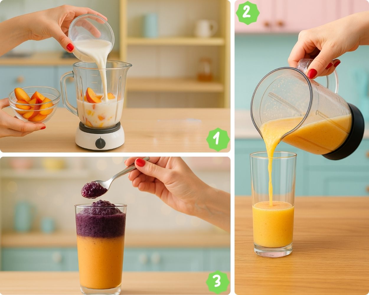 Action: Pour peach smoothie into tall glasses, filling the bottom third. Chill briefly.