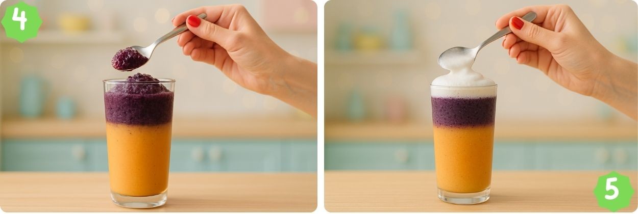 Action: Gently spoon blueberry slush over the peach layer to keep layers separate.