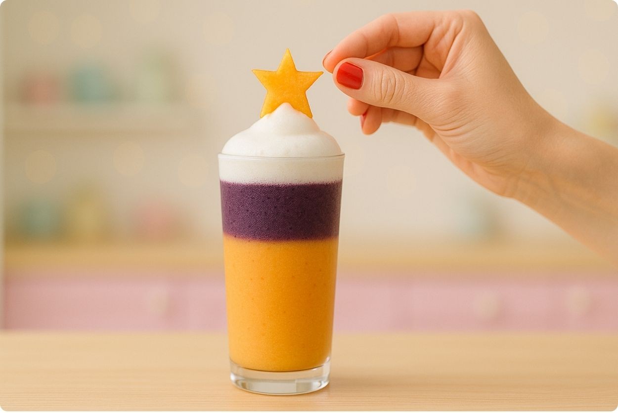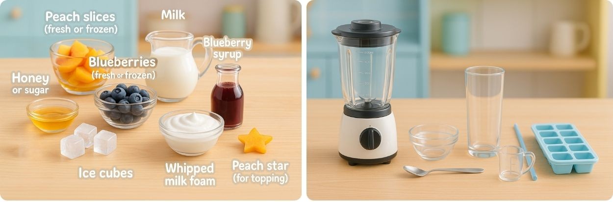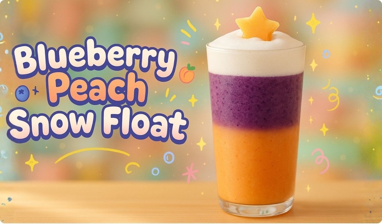 A magical layered drink made with sweet peaches, juicy blueberries, and fluffy milk snow — colorful, creamy, and refreshing without any artificial colors.