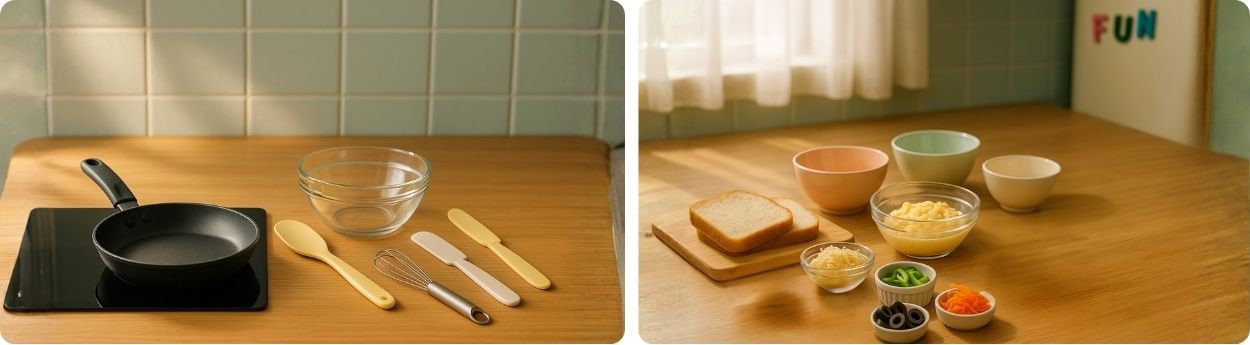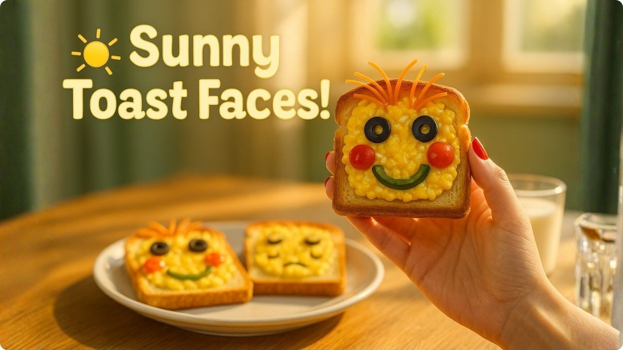 Made with golden toast, fluffy scrambled eggs, and colorful veggies — a joyful breakfast that lets kids eat their feelings with a smile.