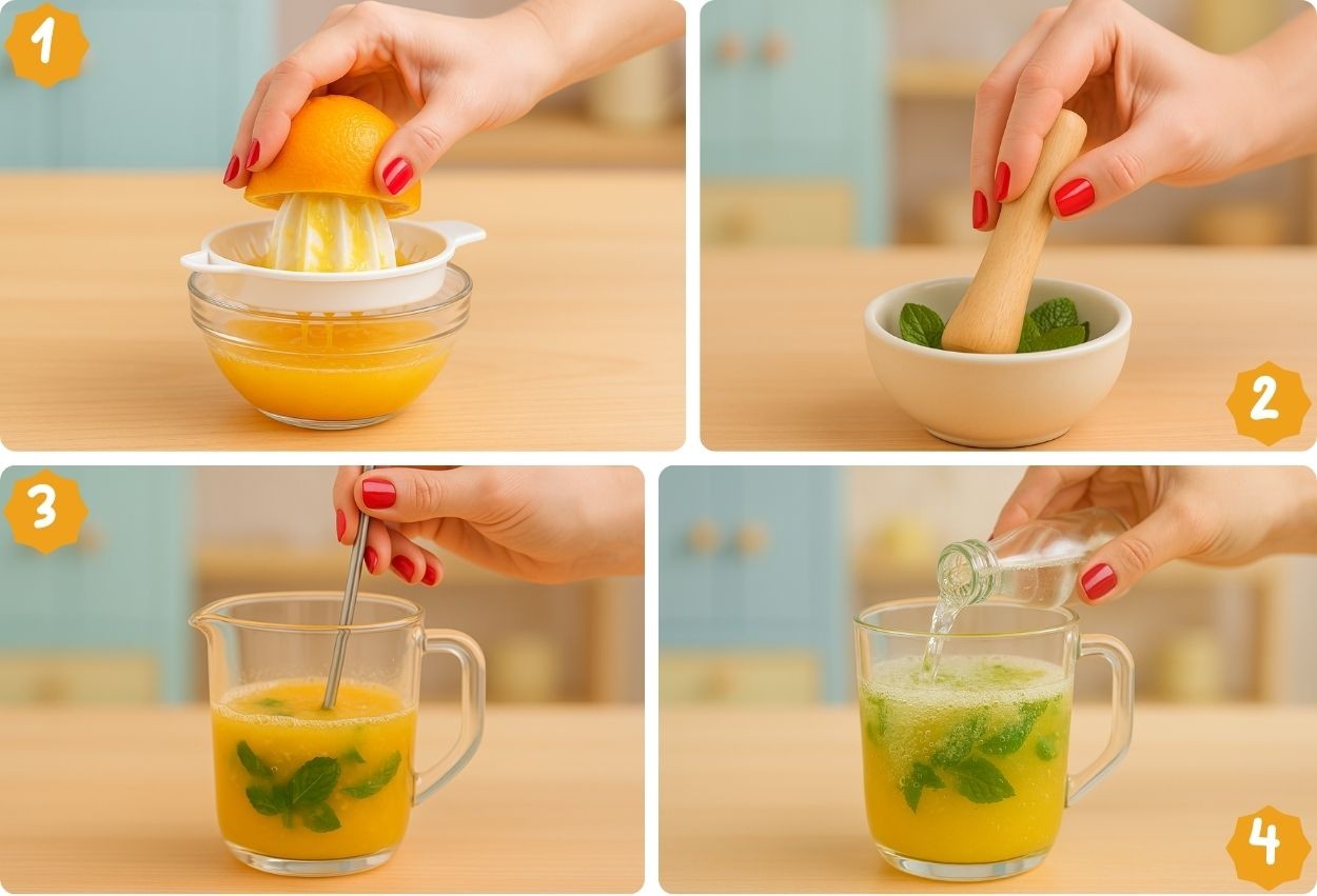 Action: Stir crushed mint into the fresh orange juice.