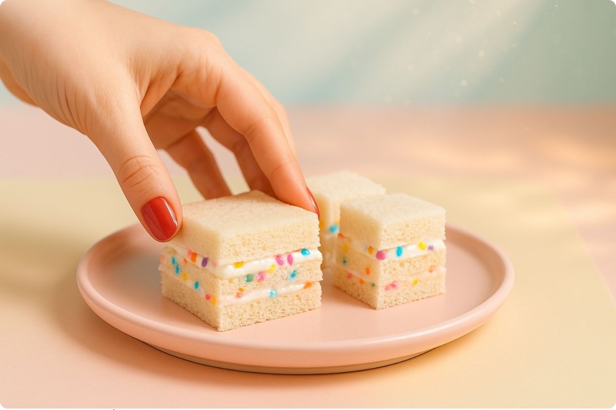 Soft bread layered with creamy filling and colorful sprinkles, cut into tiny party cubes — a fun, quick, no-cook treat for kids.