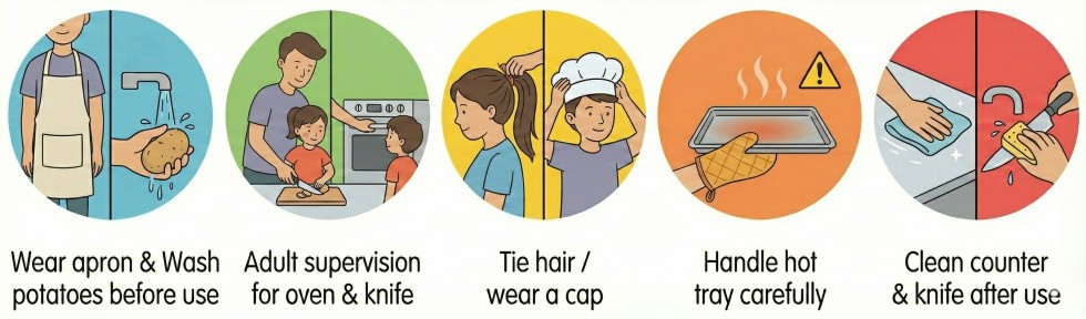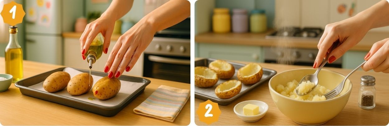 Action: Wash potatoes, prick with fork, rub with oil, and bake until soft.