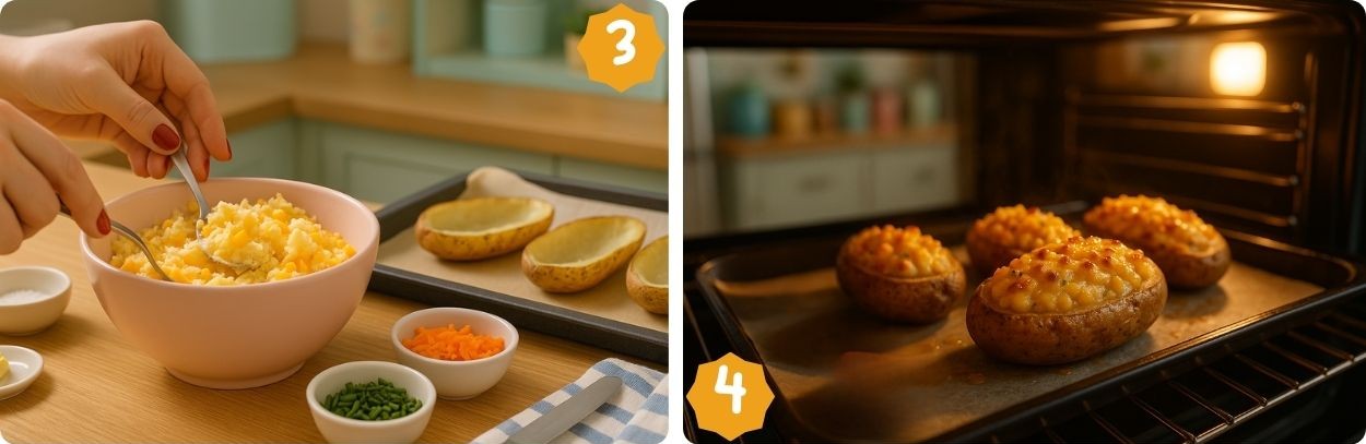 Action: Mix cheese and veggies into mash and refill potato shells.
