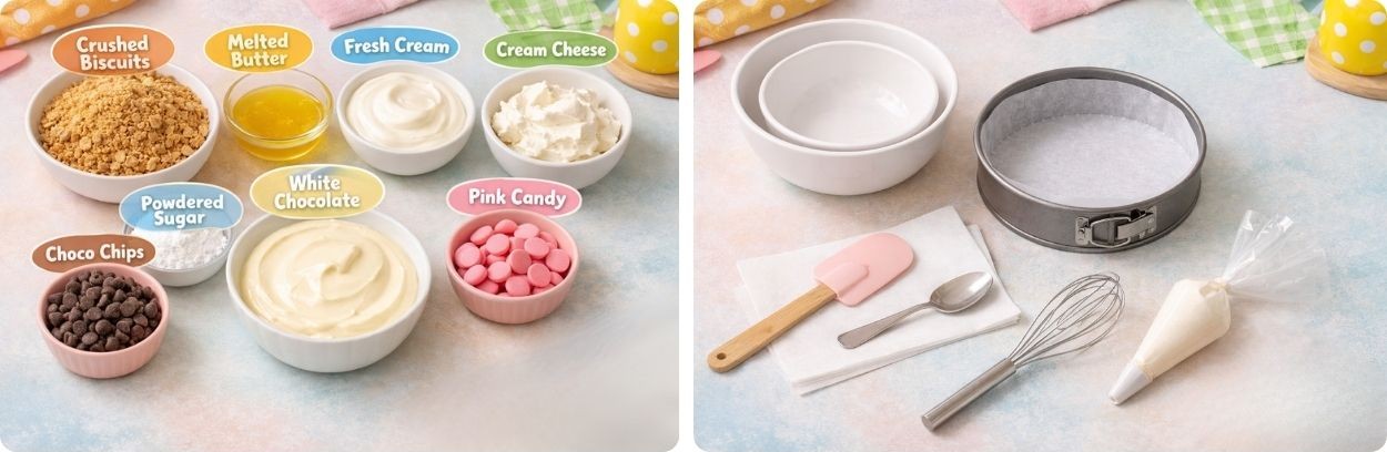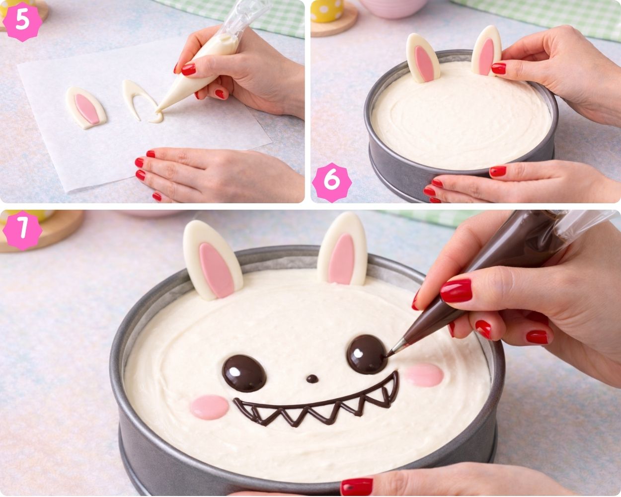 Action: On butter paper, pipe bunny ears using melted white chocolate or fondant. Add pink chocolate for inner ear detail. Let ears set before handling.