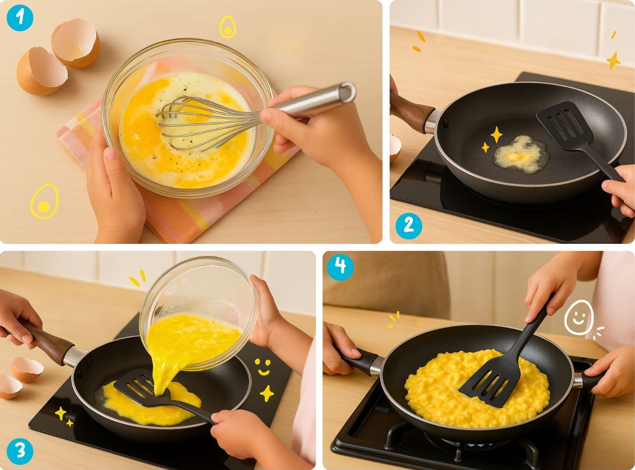 Action: Stir gently until fluffy scrambled eggs form.