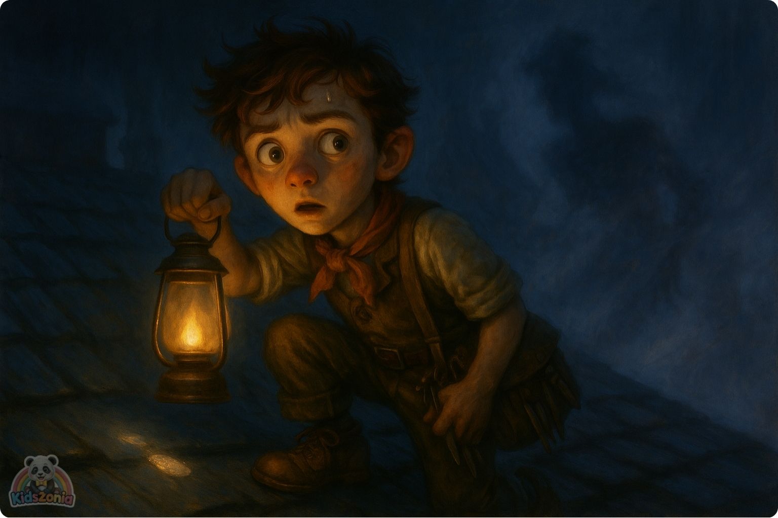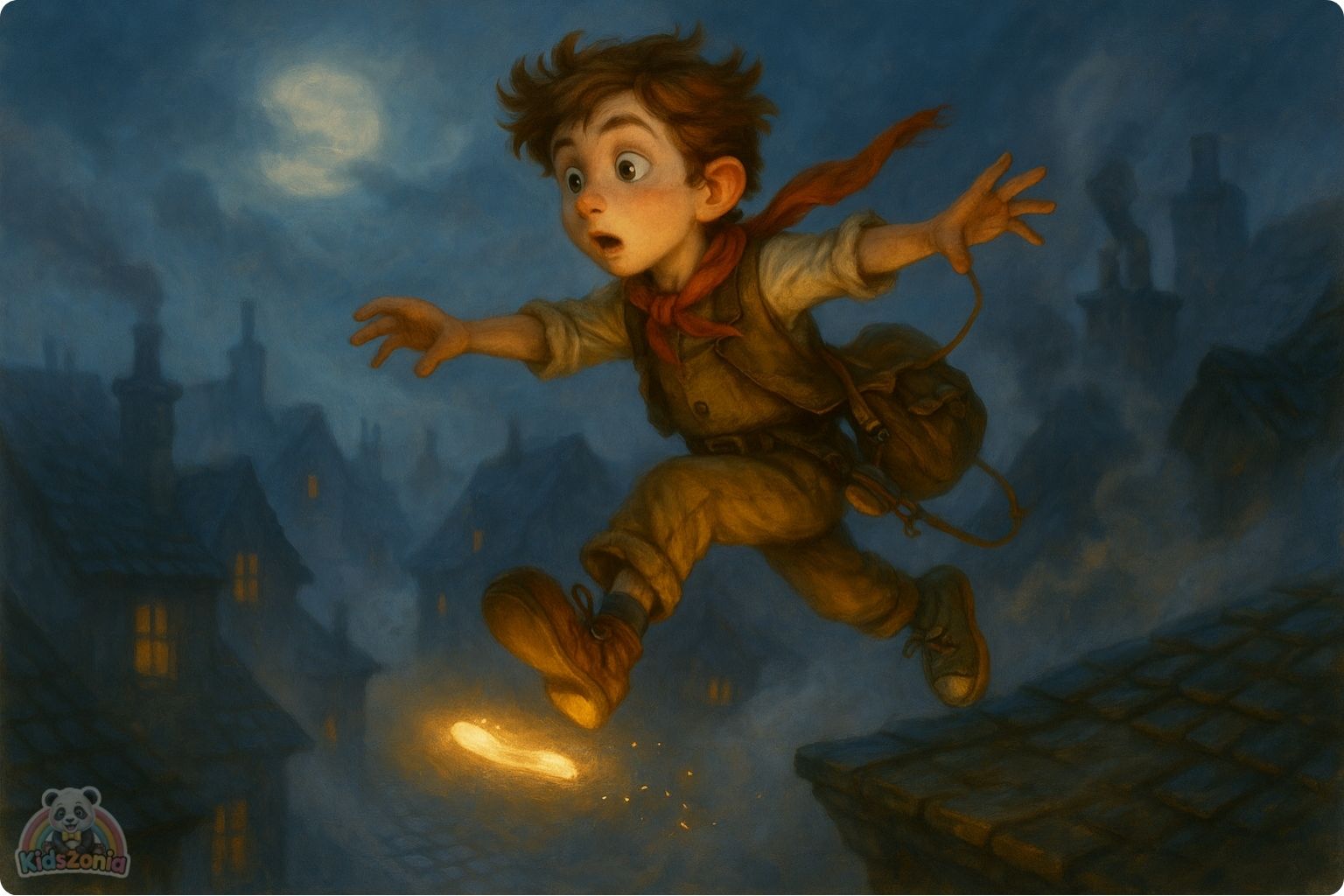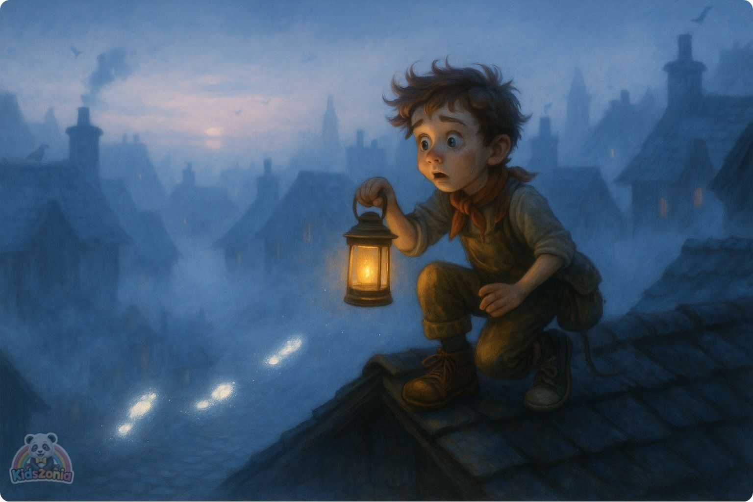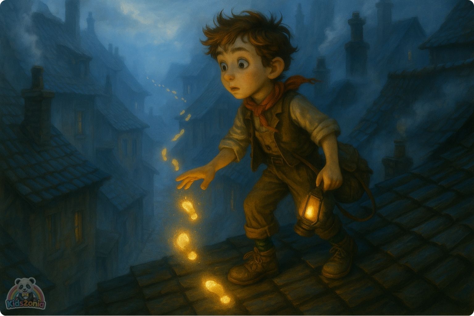 The rooftops of Fogbottom were still wrapped in silver mist. Pip crouched where the glowing prints had vanished the night before. His eyes were tired, but the sparkle of curiosity hadn’t faded. He leaned forward, lantern close to the tiles. A faint shimmer appeared — golden footprints, floating like stars just above the roof. He grinned. “You’re not done with me yet, are you?”