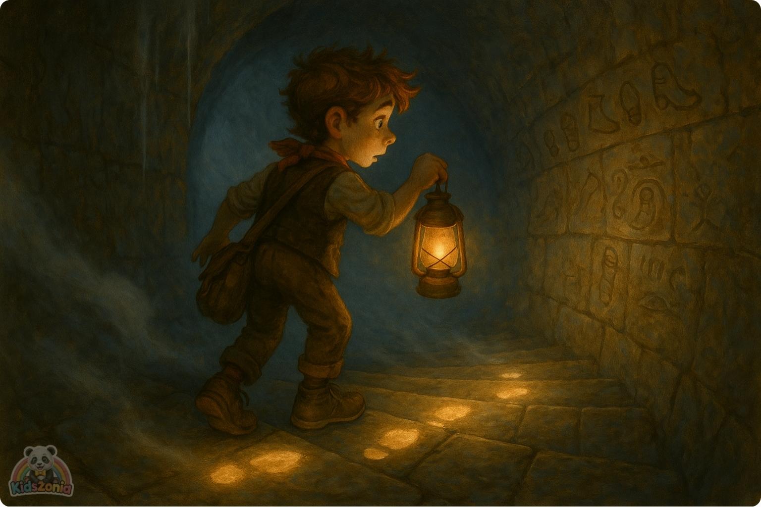 The prints drifted toward a stairway that spiraled underground. Pip followed, each step glowing faintly before fading beneath his feet. The walls curved around him, etched with small shoe marks and strange symbols that shimmered as he passed. He ran a finger across one and felt warmth — like touching someone’s memory. “What is this place?” he breathed, awe slipping into his voice.