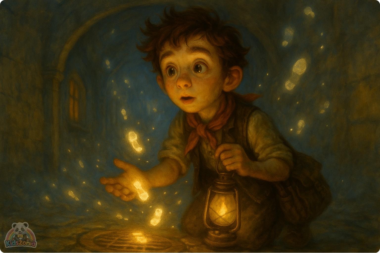 At the bottom, the air turned to light. Dust floated like gold and silver rain, but when Pip looked closer, he saw what it truly was — tiny glowing footprints, drifting through the air like fireflies. One landed softly in his palm and vanished in a spark. He smiled. “You’re not lost, are you? You’re just remembering.”