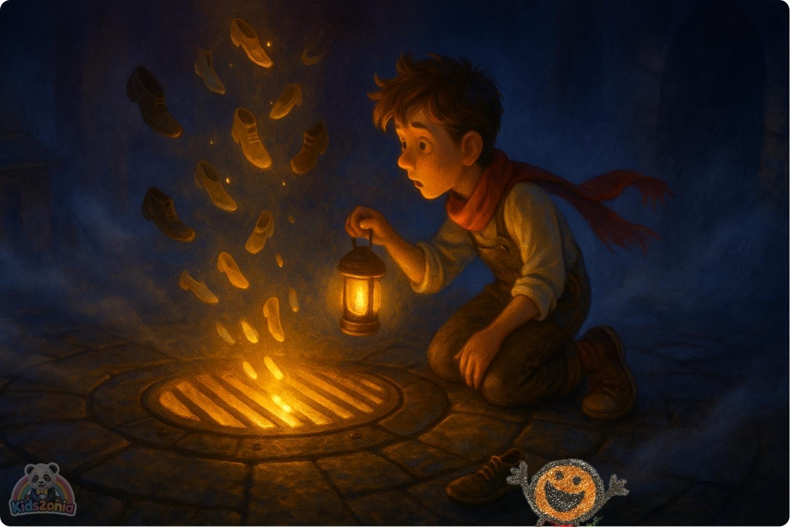 Then the tunnel opened wide. In front of him glowed the old iron grate he’d seen beneath the streets above — but now it blazed like a sun trapped underground. Shoes drifted toward it, dissolving into light as they reached the center. Pip knelt, his lantern dim beside the golden flare, eyes wide with wonder. He wasn’t afraid anymore. He understood. The fog hadn’t stolen the shoes — it had kept their stories safe.