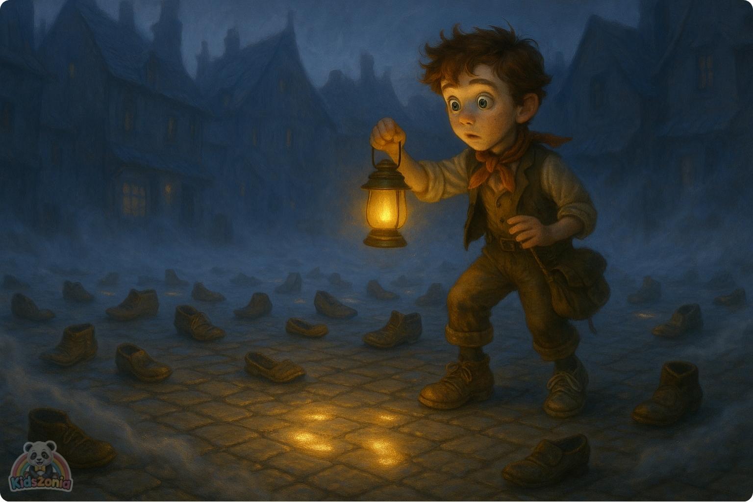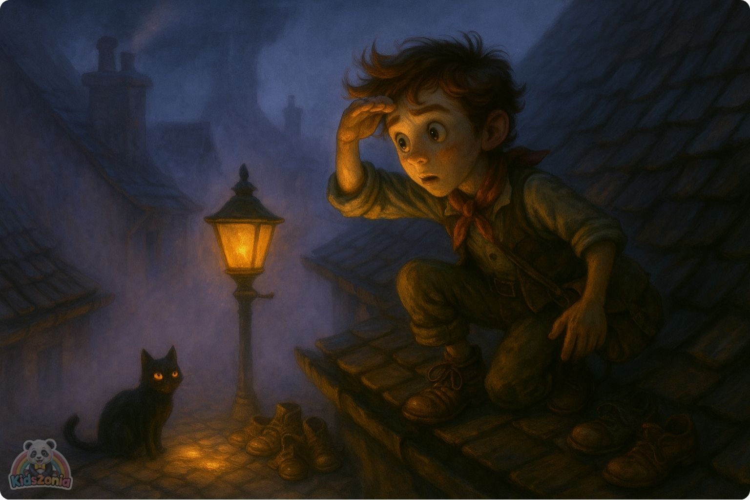 Down on the street, an old lamppost flickered weakly through the haze. Under it sat a black cat, eyes glowing amber. At its paws — a pile of mismatched shoes. The cat looked up at Pip, meowed once, and slipped away into the fog. Pip leaned over the edge and whispered, “Wait! Come back!” But only silence remained — and the faint glow of footprints heading deeper into the mist.