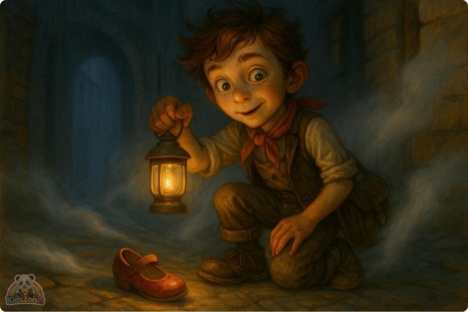 A faint motion caught his eye — a small red shoe sliding gently across the ground. It turned once, pointing toward a narrow tunnel between two houses. Pip knelt beside it, breath misting in the chill air. The shoe glowed brighter, waiting. He smiled faintly. “All right then. Lead on.”