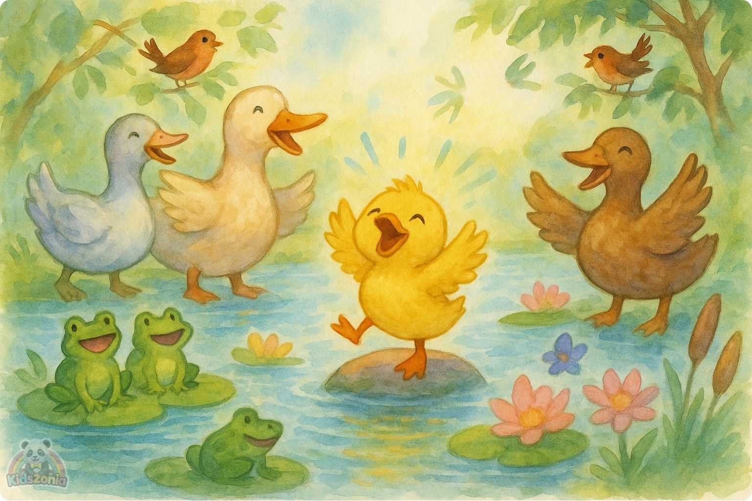 The pond cheered — quacks, croaks, and chirps all together.