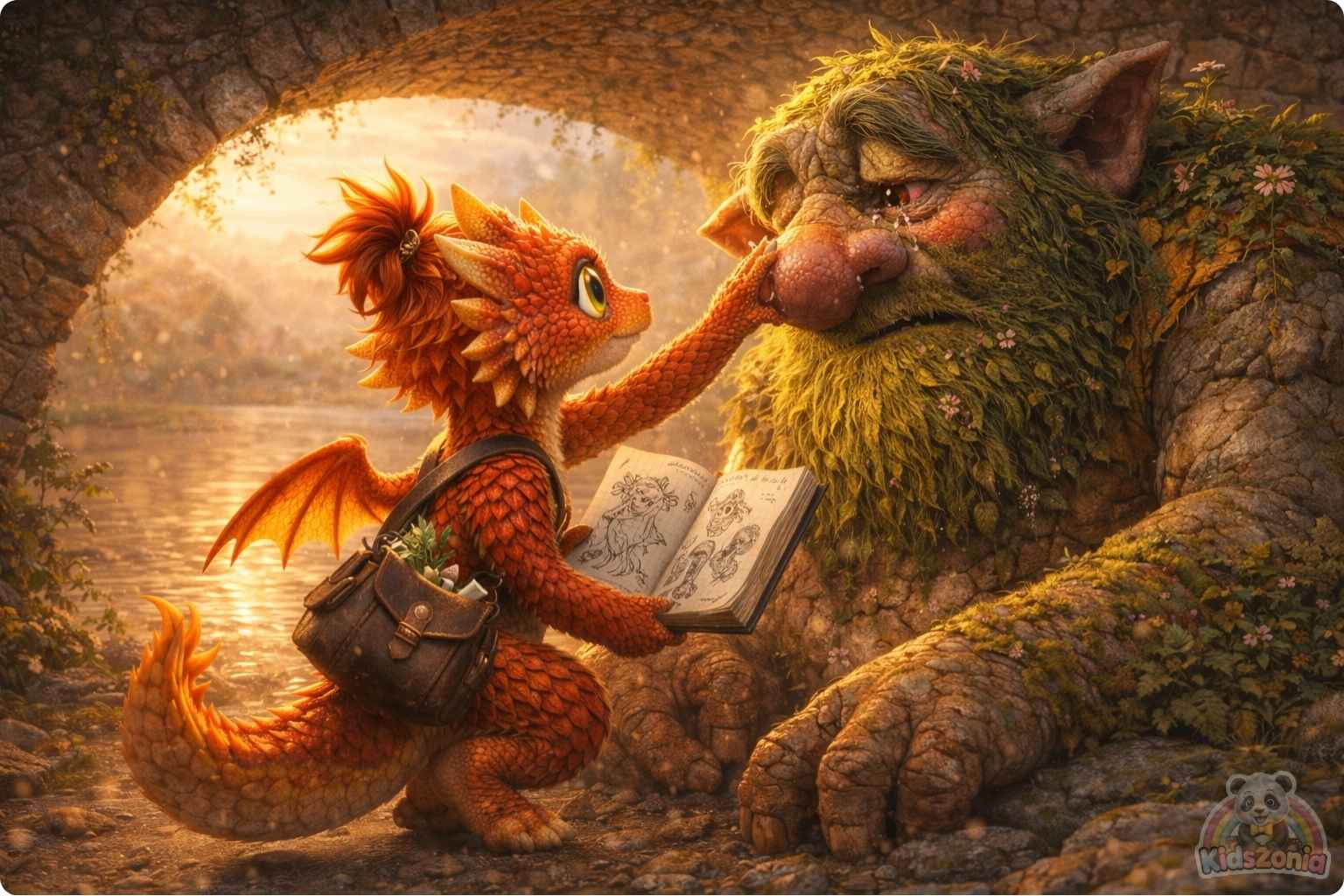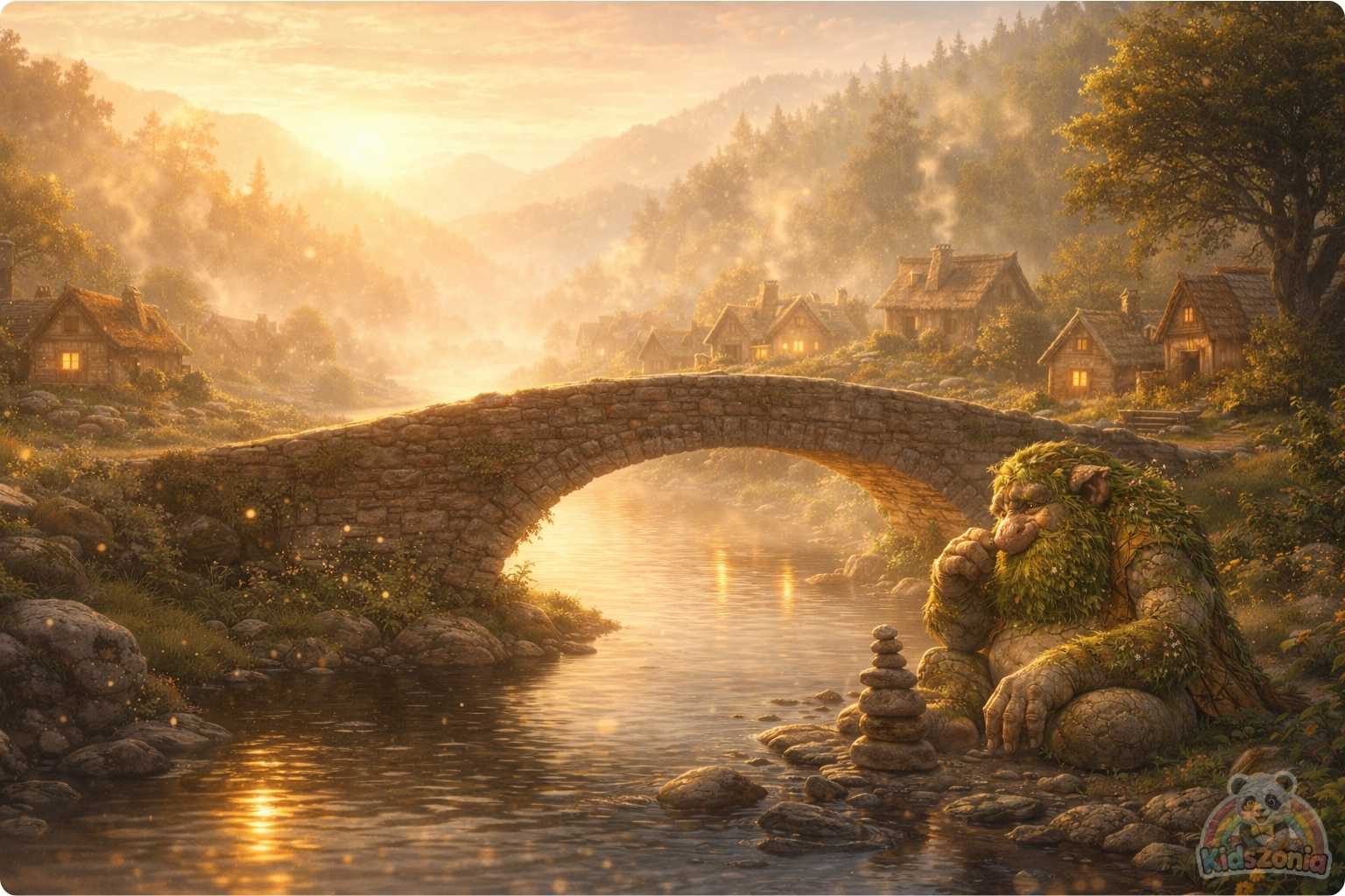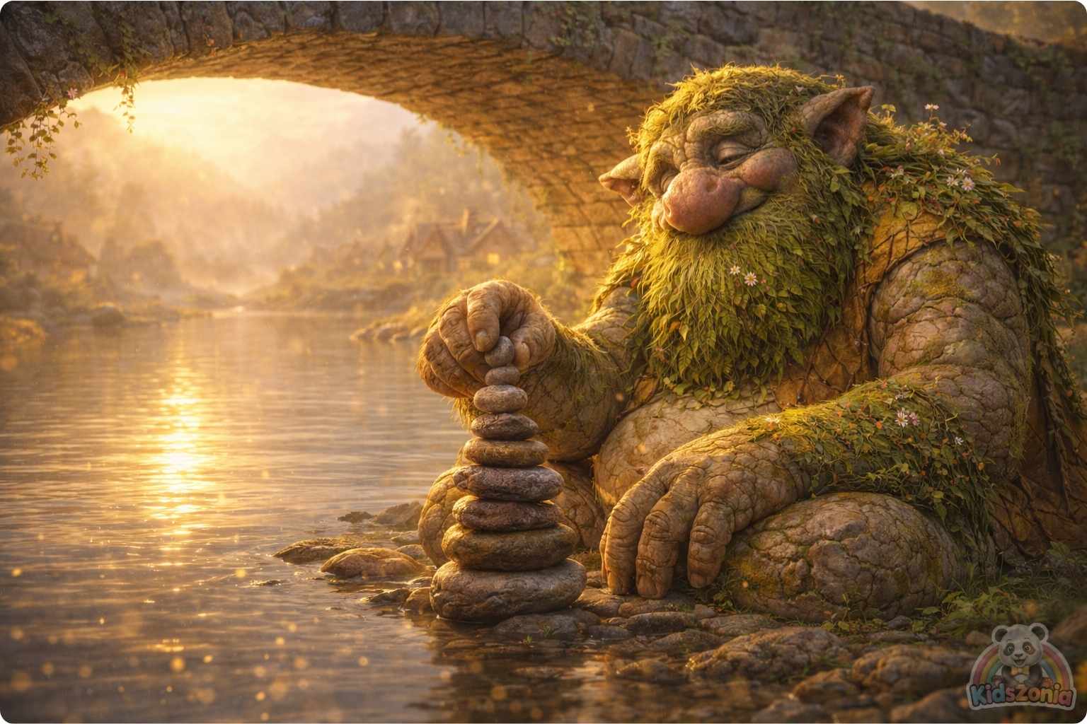 Beneath that bridge lived Grumble. Grumble the Troll was enormous, with moss-green skin, vine-like hair, and shoulders like boulders. But despite his size, he was gentle. Every morning he swept leaves from the bridge for the villagers.