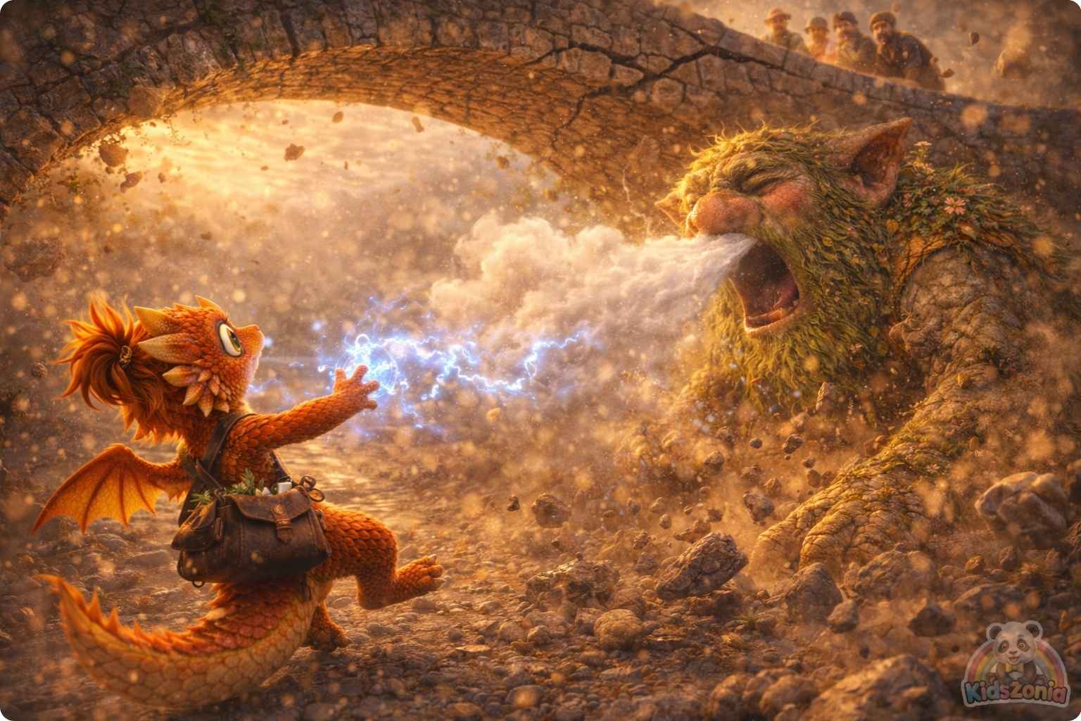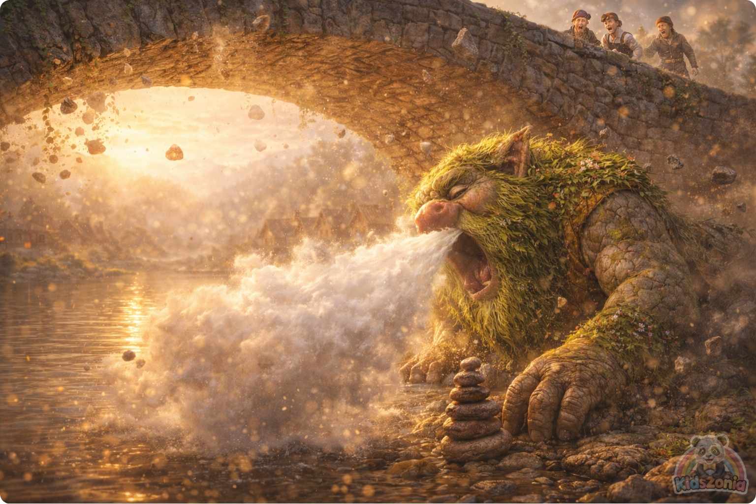 The bridge shook. Dust sprinkled down into the river. Villagers froze mid-step as another sneeze followed. “HHH—RAAAASHOO!” A crack zigzagged across one of the bridge stones.